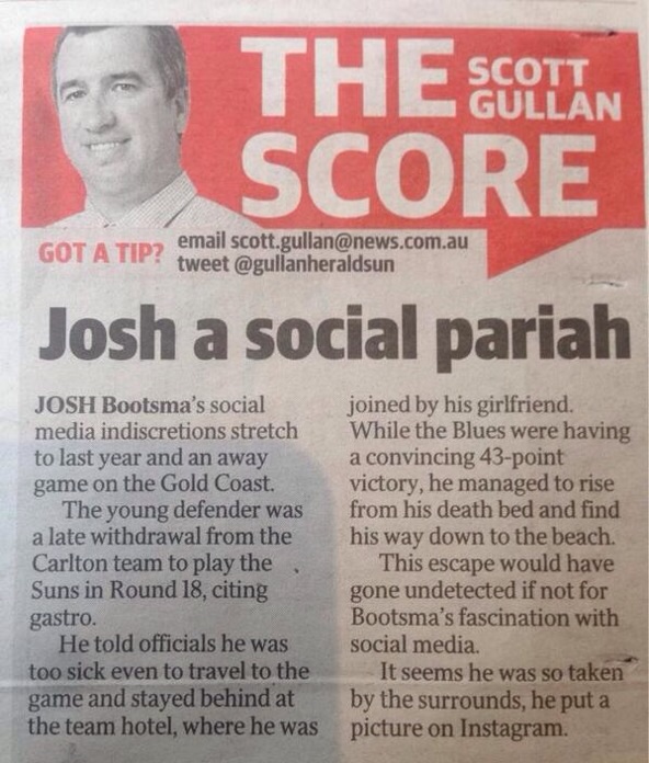 Bootsma is selected to play Gold Coast last year up in the Gold Coast and in the morning of the game he says he has an upset stomach and can't play. He is replaced in the team and stays back at the hotel and hooks up with his girlfriend and has some fun at the beach. Even posted photos of his adventures.